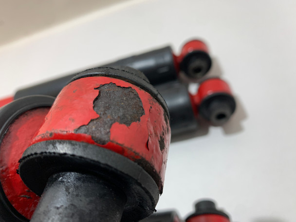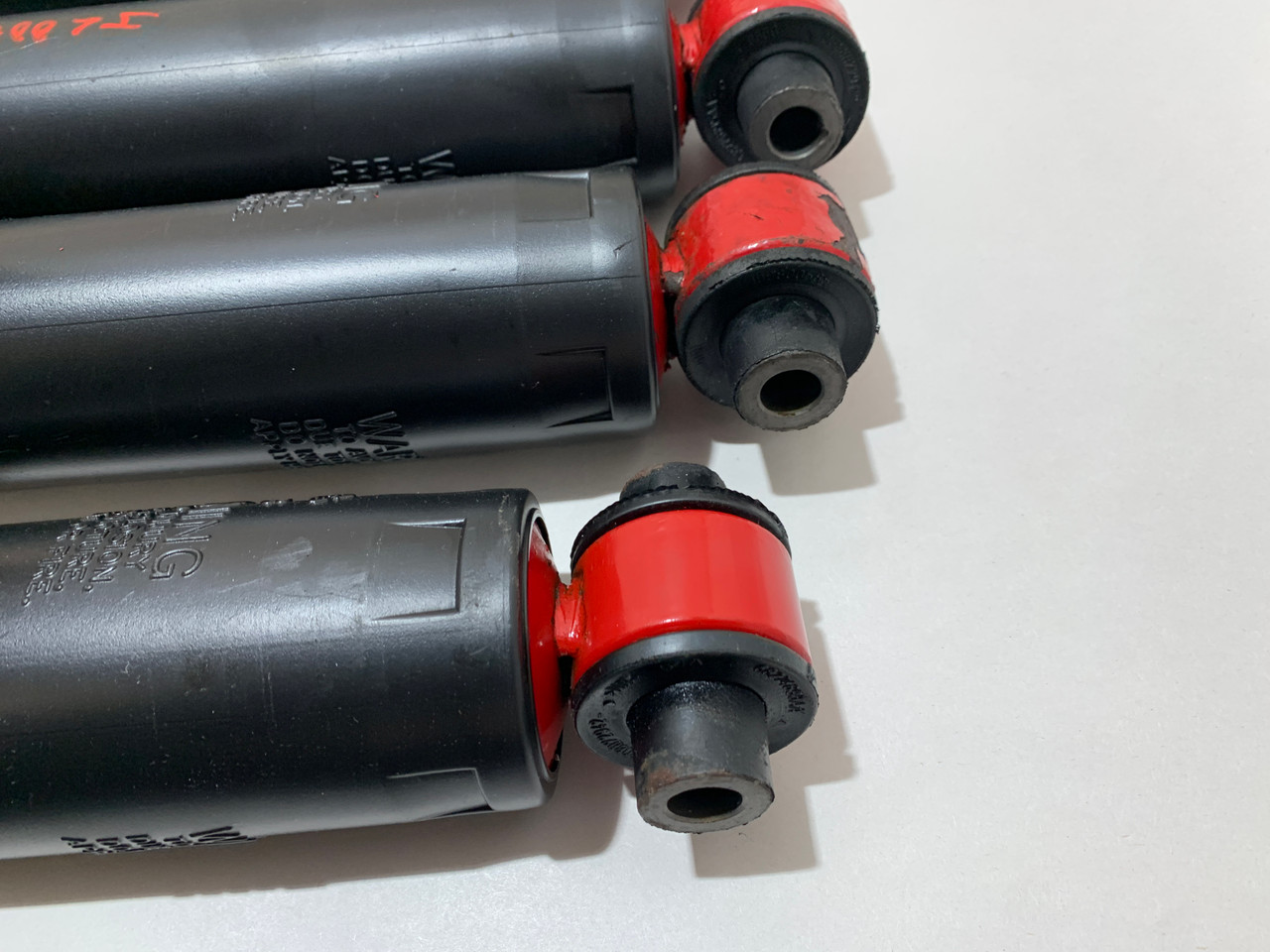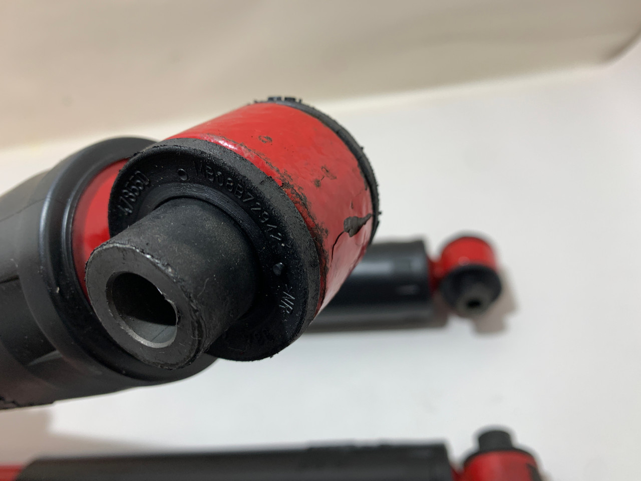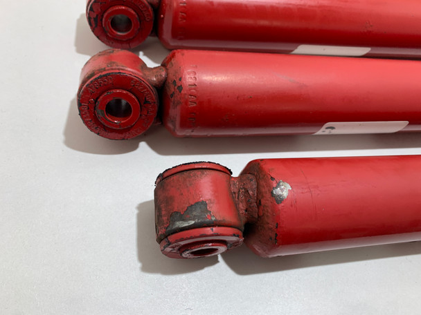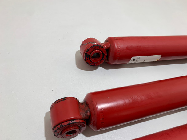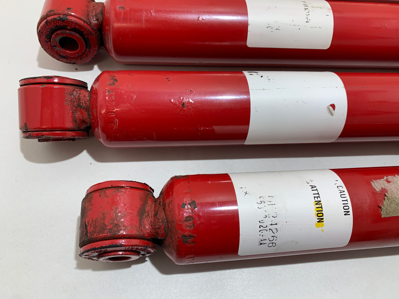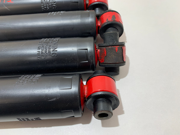 Includes the set of 4 factory Rubicon shocks as shown. In good physical condition, have not been hit or bent in any way. There is some paint peeling and surface rusting on the upper and lower mounts as seen in the photos. Shocks showed no signs of leaking or internal damage. You will need to reuse some of your existing hardware for installation.